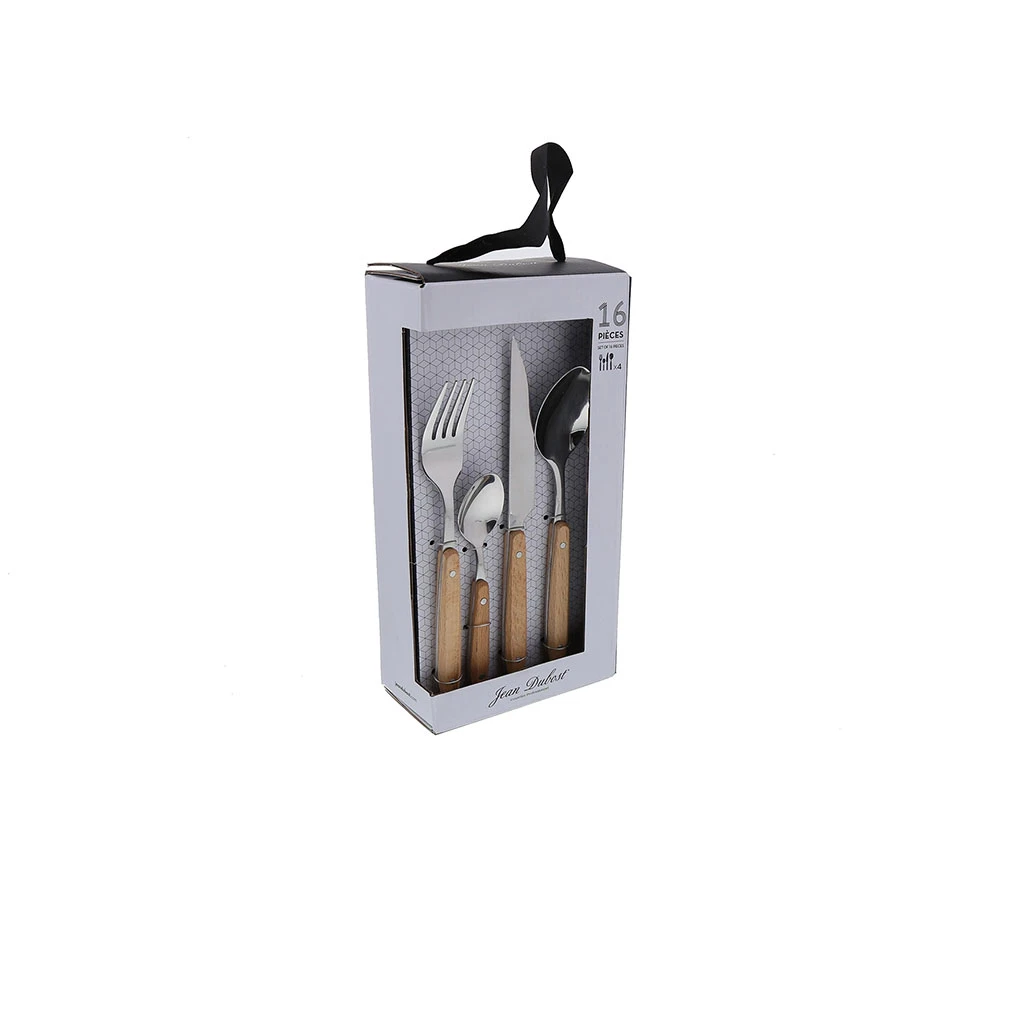 Découvrez la ménagère Woody, une collection de couverts de 16 pièces, mêlant subtilement l’acier inoxydable et le bois pour apporter une touche naturelle à vos repas quotidiens.